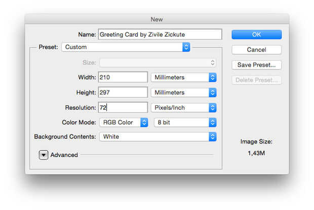Después de hacer que te saldrá una ventana donde tienes que elegir el tamaño de la tarjeta de felicitación. Puede introducir el tamaño en píxeles o en milímetros. He elegido milímetros. Si desea imprimir una tarjeta de felicitación grande que recomiendo ajustar la resolución a 300 de lo contrario usted puede dejar a 72 píxeles.