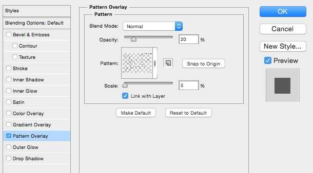 Doble clic en el capa que tiene y haga clic en aceptar. Haga doble clic otra vez en la misma capa y usted obtendrá la ventana donde tienes que seleccionar superposición de motivo de la función. Después de hacer que usted será capaz de establecer el patrón. Haga clic en la imagen del patrón y seleccione el patrón que creó en el paso anterior (será la última). Usted verá un cambio. Haga clic en nuevo en la imagen del patrón (mismo lugar donde hizo clic antes) y luego establecer la escala en el 5% y la opacidad al 20%, haga clic en Aceptar.