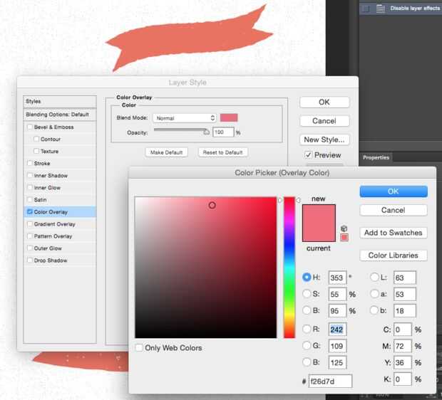 Ahora necesita establecer el color de las insignias. Haga doble clic en cualquiera de la capa de placas, seleccionar superposición de Color haga clic en el color y definir el color que desea (hacer esto con todas las divisas). Utilicé colores #555555 y #f26d7d.