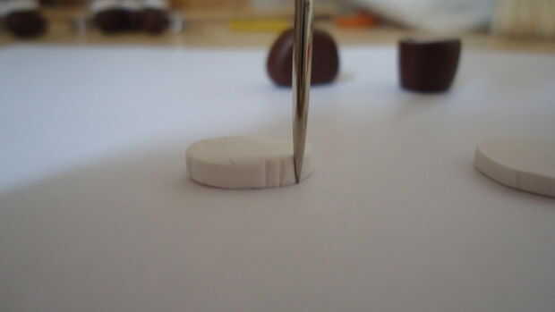 Usar lo puntiagudo agudo para hacer abolladuras en la tapa. Trate de hacer los espacios incluso. Sí, ya que las tapas son de color blancas, que voluntad gel un poco sucias con pelusas y esas cosas. Pero no se preocupe, nosotros nos encargamos de que más tarde, después de la cocción.