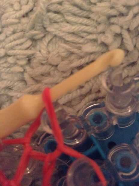 Ir a la banda de la gorra roja y su gancho bajo y hacer lo mismo, hacer una extensión de bandas 5-7. Cuando haya terminado, tire el telar y coloque el clip