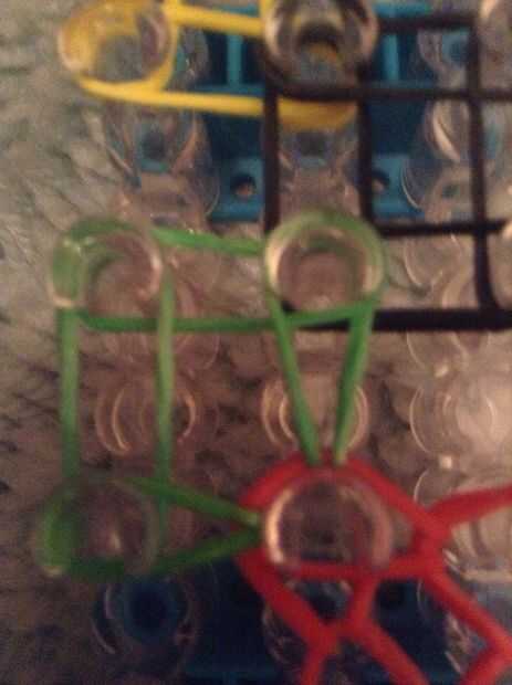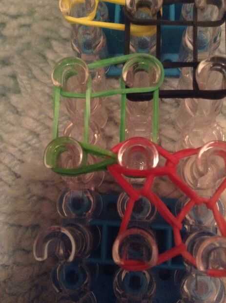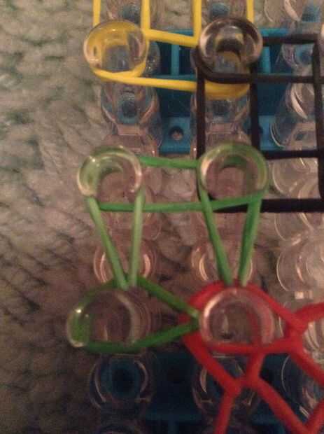 Hacer las bandas en el lado izquierdo es un poco diferente. Tomar la primera banda de verde y llevar a la izquierda. Volver al pin que la banda vino de y adelantar esa banda. Ir a la banda izquierda adelantar y llevar la banda a su lado hacia los lados. Para ello, lados de la conmutación hasta el final del telar.