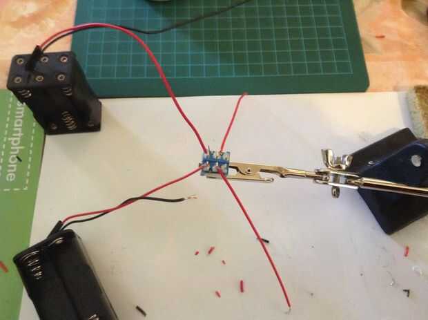 Los dos cables rojo superiores (como se ve en la foto) son en realidad la salida positiva de la caja de la batería de 6XAAA. Este producto positivo es interrumpido por el interruptor.