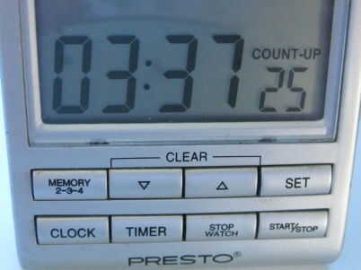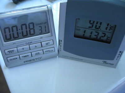 Porque no tengo una en el termómetro en mi deshidratador utilizar uno de los interiores y exteriores con el cable conectado a través de y el botón cerca de los yogures. Trato de mantener una temperatura constante entre 110 y 115 grados. También puse un cronómetro de cuenta ascendente porque he tenido yogurt situado en tan poco como dos horas y me gusta comprobar a menudo. Yo solía pensar que tenía que salir de noche a la mañana pero descubrió más lo deja en la cata más fuerte se convierte, y que no estaba buscando un yogurt de sabor fuerte.  Generalmente cerca de 4 horas, dar o tomar, es suficiente para mí. Este lote se realizó en exactamente 3 horas y 37 minutos.