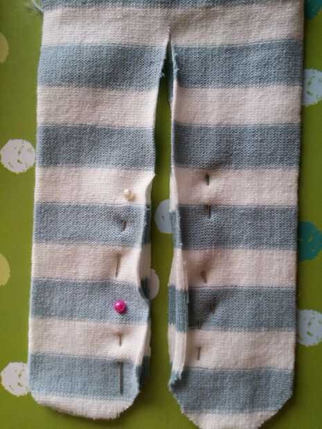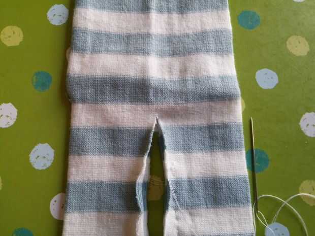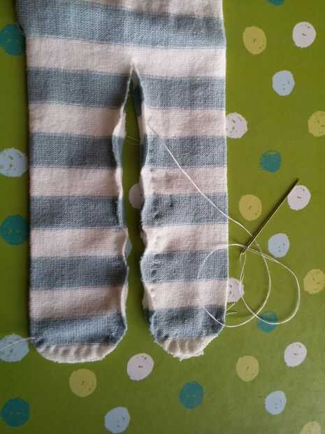 • Necesita coser primero la primera pierna del borde exterior. Empezar por la costura y anudar el hilo en el borde y luego coser todo el camino hasta la pierna, dejando unos 5cm antes de llegar a la parte superior de la misma (necesitarás esta en ambas piernas por lo que ya tienes un lugar para rellenar su mono). Hacer un nudo y cortar el hilo.