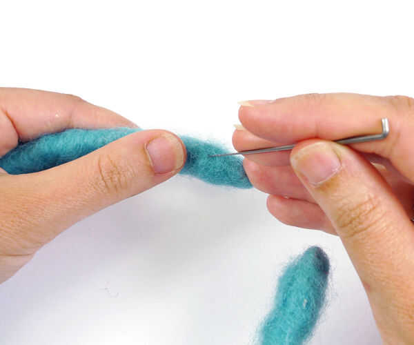 Tomar la diadema de tela cubierta y abrigo de lana de mecha en la punta de la diadema. Inicio fieltro con su aguja en la punta de la diadema. Una vez que el extremo de la diadema ha sido felted continúan envolver firmemente alrededor de la diadema y fieltro con su aguja en el camino. Cubrir la banda entera.