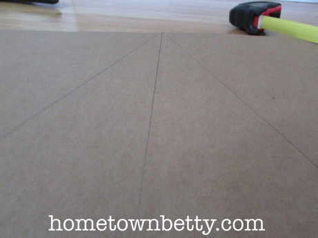Medida para encontrar el centro de cartón. Marque una línea larga de centro a esquina inferior izquierda de la cartulina. Marque otra línea larga de centro a esquina inferior derecha de la cartulina.