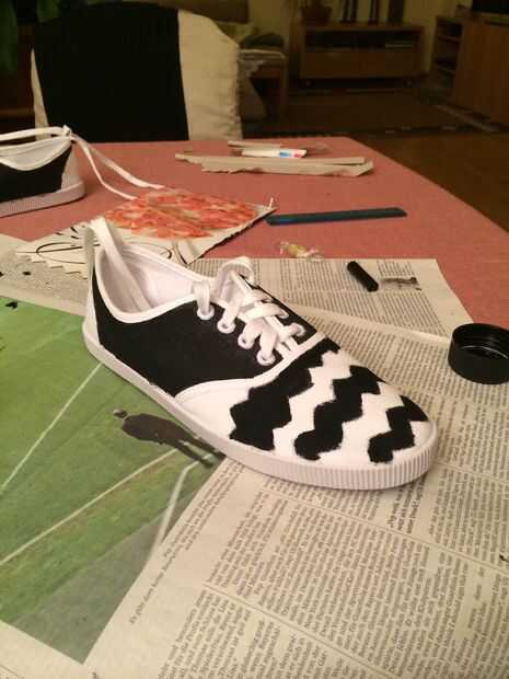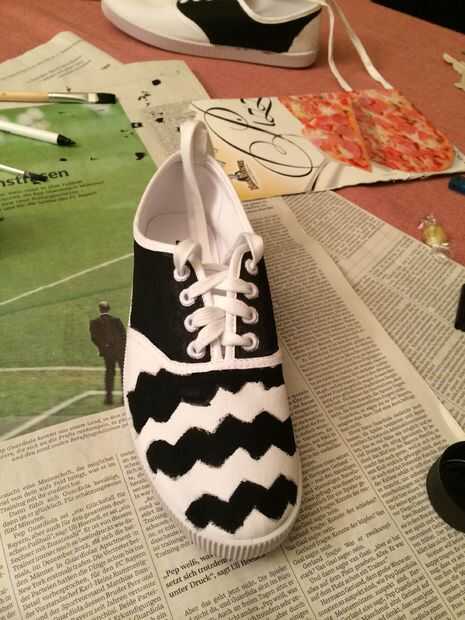 Luego, dibujar sobre los rastros de lápiz con un marcador negro con punta pequeña para establecer las diferentes líneas, y entonces ya puede iniciar el proceso de pintura en el zapato, estilo Mizzoni. Ahora, debe utilizar la pintura negra y color cuidadosamente en cada área de segunda, así que detrás de cada segunda línea. Hacer esto hasta el final, por lo que tendrá un patrón blanco y negro.
