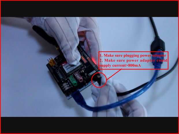 6 Presione y sostenga el botón de encendido un corto tiempo (más de 3 segundos) en el escudo de GPRS para encenderlo. Espere medio minuto para el escudo de GPRS para conectarse a la red (red LED empezará a parpadear cada 3 segundos o menos). Si continúa parpadeando cada 800mS, que significa que efcom no se puede conectar a Internet, por favor, tire de la tarjeta SIM y re-plug it o probar otra tarjeta.