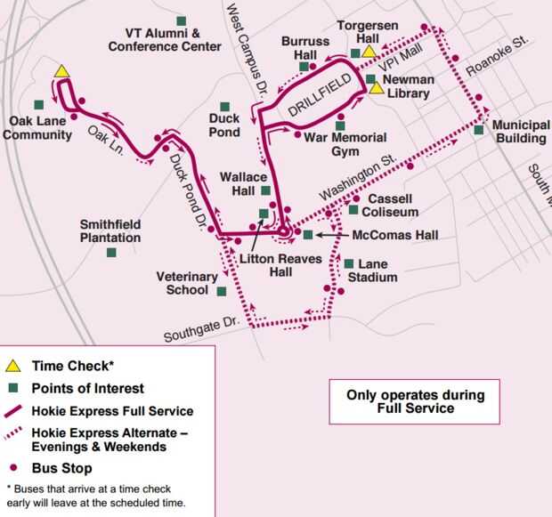 Durante el servicio completo el Hokie Express circula alrededor de la Drillfield y a la comunidad de Oak Lane – donde están muchas casas de hermandad y fraternidad. Algunas paradas son Burruss pasillo, pasillo de Litton Reaves, gimnasio Memorial de guerra y por supuesto Oak Lane. Este autobús es gratis así que no necesita sacar su pasaporte de Hokie!