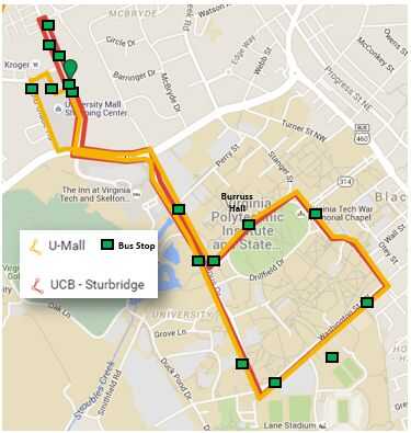 ¿Necesidad de ir al Empo de matemáticas, Kroger o a la oficina de correos? Luego tomar la Universidad Mall Shuttle (UMS) o Boulevard de ciudad universitaria (UCB). Estos autobuses paran en el campus de Litton Reaves, McComas, Burruss pasillo y biblioteca de Newman. Alternan en la misma ruta a frecuencias de 10 minutos. La única diferencia es lunes al viernes durante las semana UMS no servicio Sturbridge Square apartments.
