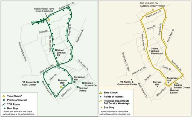 Estos autobuses pueden llevarle a vista de la terraza y los complejos de apartamentos de la aldea. El autobús del progreso calle ofrece servicio durante la "Semana de servicio completo" solamente. En otros momentos puede tomar Toms Creek B (TCB). Puede coger la calle progreso en escuderos o TCB en escuderos o Burruss Hall paradas en el campus.