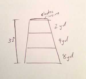 Necesita saber las dimensiones de su enagua antes de empezar a hacerlo. Mida la longitud entre donde desea que la enagua se siente en las caderas y donde usted la quiere poner fin. Añadir 1 pulgada para el doblez en la parte superior (que de los casos el cordón elástico). Tiendo a coser las costuras del lado grueso y es más fácil quitar la tela que añadir, para añadir otra. 5 pulgadas para cada costura. Hay uno entre tier 1 y tier 2 y otro para el nivel 2 al nivel 3 y el dobladillo en la parte inferior. En general, es longitud + 2.5. Mina ascendió a aproximadamente 34.5″. Doblé hacia arriba a 35″. A continuación, es necesario dividir la longitud por 3. Mina era 32, así que doblé a 10.5″ por nivel. Adición de la longitud de tela extra, hice la capa superior de 12, y el segundo y tercer nivel eran 11.5″ cada. A continuación, debe averiguar el perímetro de cada nivel. Aunque he escuchado si una medida general para una falda de campesina (una falda con gradas que se parece mucho a una enagua) no lo utilizo para este tutorial. De cualquier manera, voy a enumerarlo en caso de que alguien quiere utilizar para una enagua menos voluminosa. Nivel 1: circunferencia de la cintura x 1.5 nivel 2: circunferencia de la cintura x 2 nivel 3: circunferencia de la cintura x 2.7 ahora, aquí están las medidas que utilicé para mi enagua: nivel 1: 2 yardas nivel 2: 4 yardas nivel 3: 8 yardas es un montón de tela, así que yo sugeriría usar una tela ligera. Aunque usé algodón y muselina, nada ligero hará. Si no desea tan voluminosa como la mía, me gustaría sugerir cortando la circunferencia en el segundo y tercer nivel. Nota: Si desea que más de una falda de campesina, no tendrás que utilizar a casi tanta tela para el vestido!