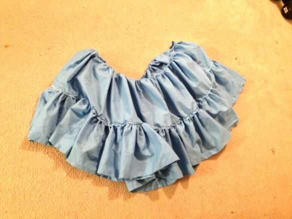 Dependiendo de tu habilidad y fantasía cómo es la máquina de coser, usted puede hacer este paso en una de dos maneras. Necesita reunir la parte superior del nivel 3 para la circunferencia de la tier 2. Opción 1: Si sabes cómo, sugeriría usar una 'se reúnen puntada' en nivel 3. Esto puede hacerse utilizando una puntada recta y con las tensiones subido completamente en su máquina. Esto funcionó alrededor del 50% del tiempo para mí, así que tuve que dependen de la opción 2 el resto del tiempo. Opción 2: Utilizar una puntada de hilvanado en el borde del nivel 3. Por aferrarse a un hilo de rosca en el extremo, manualmente se reúnen a la tela para la circunferencia deseada. Una vez que la parte superior del nivel 3 emparejada para arriba con la parte inferior del nivel 2, coser. Es más fácil de coser con el nivel 2 a la derecha y nivel 3 en la izquierda. Sólo asegúrese de encontrar un buen lugar para coser los dos juntos, ya que no toda la tela trabaja bien bajo un pie de costura normal. Una vez que el nivel 2 y 3 se suturan, repita el paso de nivel 2 a nivel 1 de la costura.