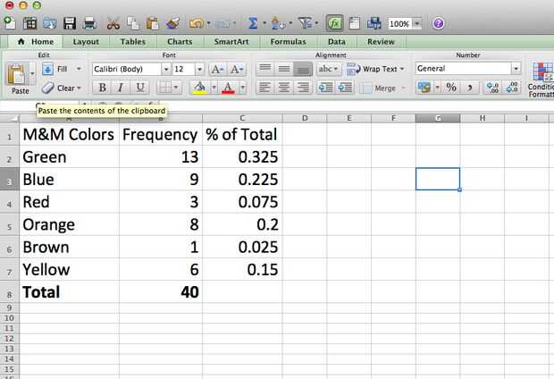 En primer lugar usted necesita recopilar algunos datos y entrar en excel. Para este tutorial hemos contado el número de cada color de m & ms en una bolsa de tamaño compartido.  Columna A es el M & M color y columna B es el número de ese color.