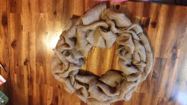 Elementos necesarios:1. paño de arpillera o tiras (por lo menos dos yardas (1,8 metros) de paño o 24 pies (7,3 metros) de 8 pulgadas (20 cm) amplia guirnalda)2. marco de corona de alambre de cualquier tamaño3. adornos de su elecciónPaso 1: Cortar la