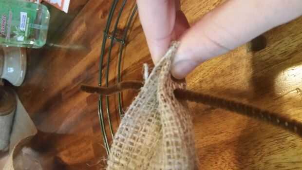 Elementos necesarios:1. paño de arpillera o tiras (por lo menos dos yardas (1,8 metros) de paño o 24 pies (7,3 metros) de 8 pulgadas (20 cm) amplia guirnalda)2. marco de corona de alambre de cualquier tamaño3. adornos de su elecciónPaso 1: Cortar la