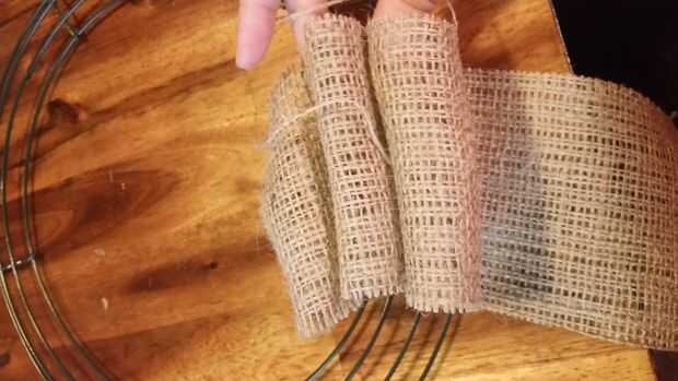 Elementos necesarios:1. paño de arpillera o tiras (por lo menos dos yardas (1,8 metros) de paño o 24 pies (7,3 metros) de 8 pulgadas (20 cm) amplia guirnalda)2. marco de corona de alambre de cualquier tamaño3. adornos de su elecciónPaso 1: Cortar la
