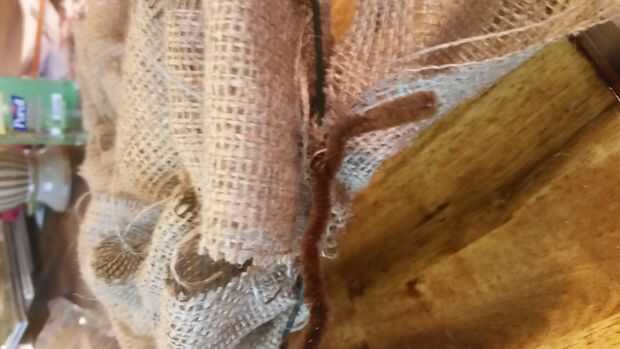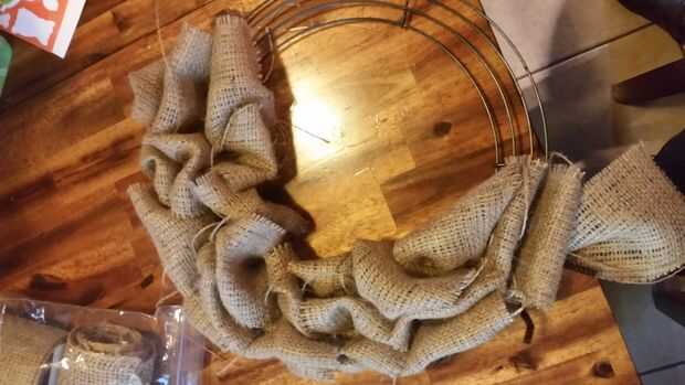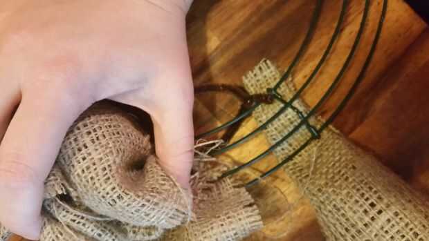 Al llegar al final de su longitud de arpillera, empuje limpiadores a través de la tela y sujete al marco de la corona. Tomar una nueva longitud de arpillera y empuje un limpiapipas hasta el final y colocar en el mismo lugar que la dejó con la última pieza. Continuar bucle y torcer arpillera alrededor de corona