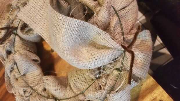 Al llegar al final de su guirnalda uso un limpiador de pipa para sujetar arpillera a forma de guirnalda.