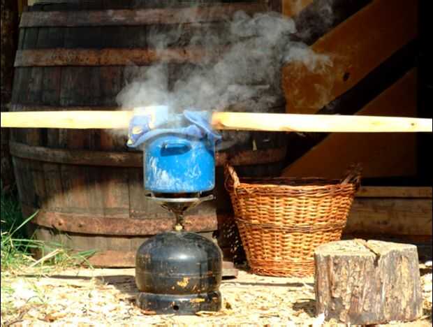 Corregir al vapor la madera. Para el manejo de este tamaño es suficiente para una hora de cocción al vapor intenso. Durante el tiempo de cocción no cuenta durante el calentamiento de agua, pero más que vapor. La figura muestra una configuración bastante simple para el puerto en un lugar de apareamiento. Parche se utiliza para desacelerar y mantener va la temperatura constante. Puesto que la madera es algo termoplástico (parcialmente puede cambiar la forma cuando se calienta) calienta la madera se deforma en la forma deseada.