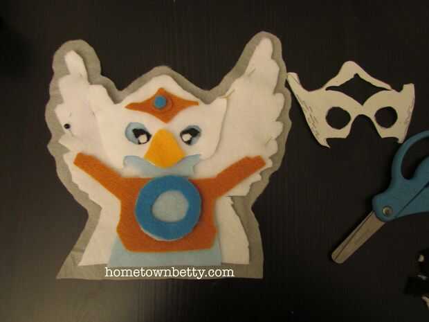 8. cortar capas detalladas, tales como los ojos, el chi en la placa del pecho y pieza de la nariz. Prender y cortar según el color de fieltro apropiado. Corte los ojos de fieltro blanco y negro. El chi en la placa del pecho se cubrió y corte de fieltro azul oscuro y azul claro. Cubrió la nariz y corte de luz naranja de fieltro. Mano coser las piezas de fieltro blanco.
