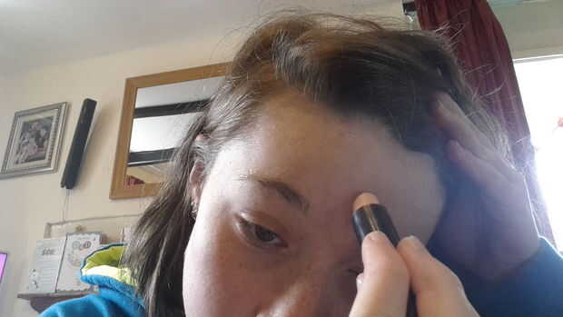 Tutorial de maquillaje de Halloween de BansheePaso 1: Vamos a empezar!1. primero pegue mis cejas, por lo que yo puedo desaparecerlos más adelante.2. luego utilizar pintura de la cara blanca.3. luego aplicarlo a mi cara y cuello y también se desvanece