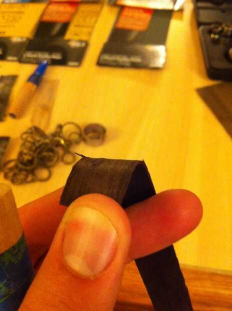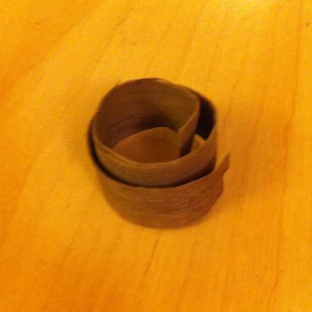 Hervir la pieza de chapa de 10-20 minutos, hasta que esté lo suficientemente suave como para rodar en un cirle sobre el tamaño del anillo que desea hacer. cinta adhesiva alrededor y que se ajustan a una bobina por un tiempo. no necesita secar completamente. Si se divide o astillas cuando envuelva, como en la foto con mi pulgar, entonces es bien demasiado una chapa gruesa, o necesita hervir más tiempo. Debe ser muy flexible. Nota que necesita envolver inmediatamente después de sacarlo del agua. Cuestión de segundos hará más difícil envolver, como comenzará a enfriar y ajuste. Cuando lo hago, me gusta almacenar piezas de 5-10 envueltos en cinta para secar para anillos más adelante. Una vez que están seca se dobló, todo lo que tienes que hacer es sumergir en un recipiente con agua durante unos segundo para hacerlas viables nuevamente. Los mejores centros para su anillo son maderas muy cortadas en chapas muy delgadas. Ha sido mi mejor suerte con nuez y cereza. Maderas suaves tienden a agrietarse y pliegue en el balanceo inicial, aunque es factible con una chapa más fina. Maderas suaves no lleve a cabo forma tan bien, así que será más gruesos en el producto final que cualquier fuerza de considerale. Para un anillo de inlayed, el núcleo se ve sólo en el interior del anillo de todos modos, así que use algo duro. Si es un anillo liso, luego use como quiera.