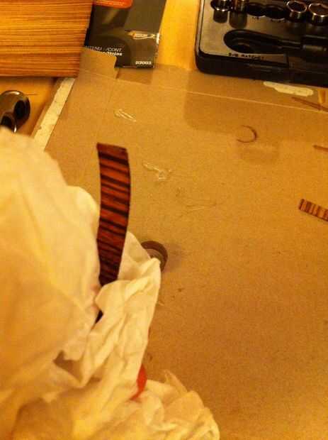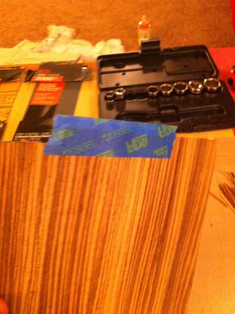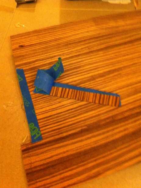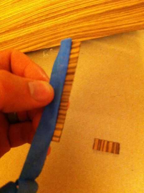 1. cortar la chapa. Tienes que usar cinta o nunca se corte en una sola pieza. Cinta adhesiva de ambos lados de la chapa, luego se corta una srip a través. He utilizado chapa de zebrano para éste