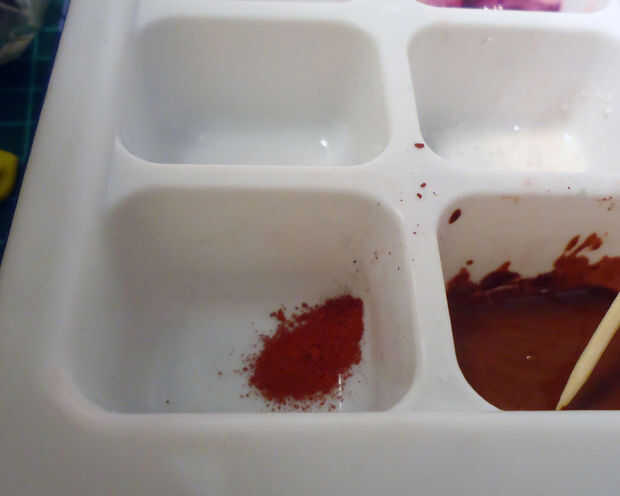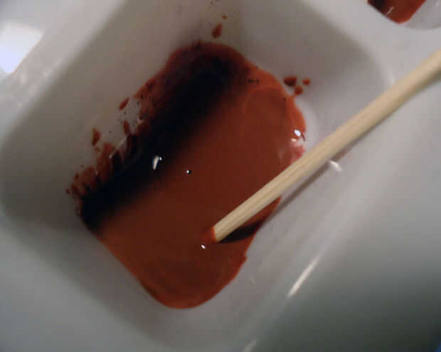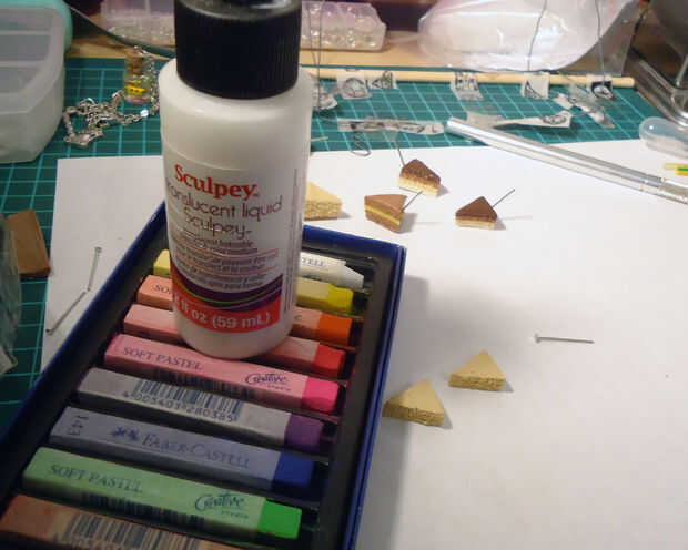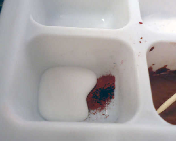 Para el glaseado, la mayoría de las veces, utilizar TLS (Sculpey líquido translúcido) + pasteles suaves. FIMO líquido debe funcionar tan bien. Para hacer el glaseado, mezclar TLS (o FL, recuerde que es lo mismo) con virutas de color pastel tiza necesita. Estaba haciendo chocolate glaseado, así que mezclé algunos negro marrón, luego algún añadido para hacerlo más oscuro. Tenga cuidado al usar negro en colores claros, aunque! Incluso añadir un poco demasiado y se te arruinara!