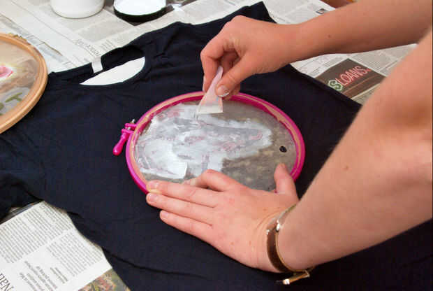 Es mejor sólo aplicar una fina capa de tinta, de lo contrario la imagen resultante puede ser algo 'blobby'. Experiencia le dirá cuánta presión se necesita aplicar para crear una imagen clara y nítida (a menudo hacer una prueba sobre un trozo de material primero). Una vez que se secó la tinta en todas las zonas de la pantalla, levante la pantalla de apagado, teniendo cuidado de no manchar la imagen arrastrándola lateralmente a través de la tela.