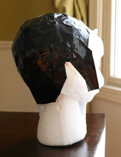 Usa cinta de pato negro, cubrir la pieza de plástico en forma de cabeza. Tomar cuidadosa nota de la rayita. Asegúrese de hacer rizos a lo largo de la línea del cabello, así que usted puede Agregar profundidad al peinado los pasos en el futuro. También asegúrese de crear una pieza de pelo desde la mitad de la frente a la parte superior de la cabeza.