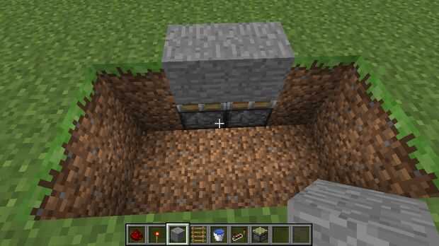 Agregar pistones en el agujero hecho, hacer espacio para el Redstone y coloque la piedra encima de los pistones.