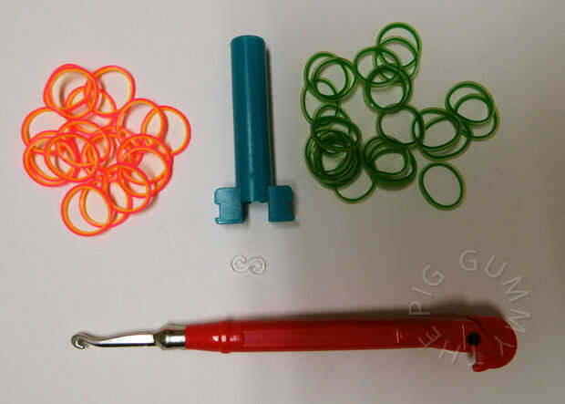 2 x gomas colores (rosa y verde). Puede utilizar cualquier color que desee. Para cada color uso 18 bandas de goma.