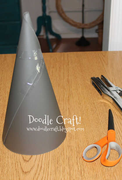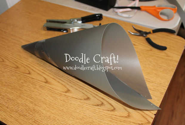 Una vez cortarlo, envuelve en forma de cono ligeramente superpuestas y utiliza cinta para sujetar en su lugar!