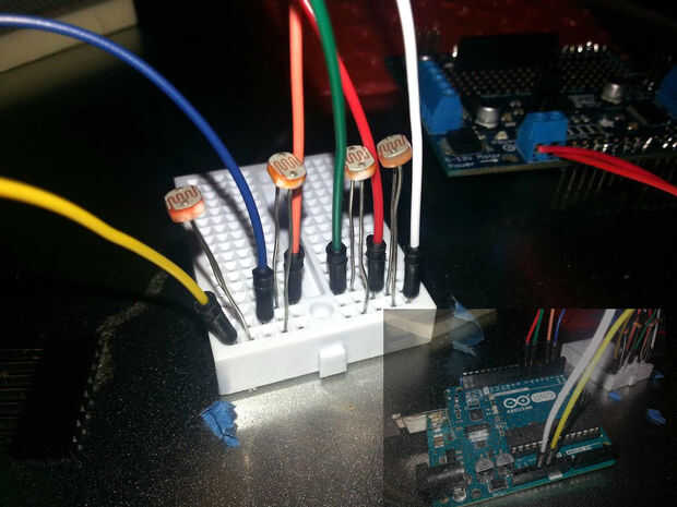Para este paso, he utilizado cables de diferente color, 4 sensores de luz y digitales pines 2,3,6 y 7. La fuente de alimentación es el Arduino Uno R3 y usar 5v y 3.3v pines para enviar energía a los sensores de luz. En la costumbre escrita biblioteca publicada por debajo, usaba cada sensor de luz en el ángulo asociado en el círculo unitario: 0, 90, 180, 270 (0 es 360). De esa manera yo puedo simular ángulos seleccionados que la plataforma girará en base al tiempo las señales eléctricas toman para llegar a la Arduino Uno R3. Para ver los resultados de la instalación solo tienes que cubrir uno de los sensores de luz y se le mostrará el tiempo que tarda cada sensor enviar señales eléctricas hacia atrás.