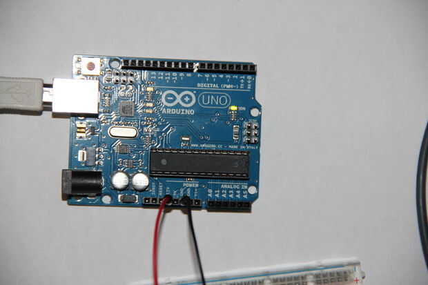 Tomar un cable de puente rojo y en el orificio con la etiqueta ' 3,3 v '. Luego, tome un cable puente negro e introdúzcalo en el agujero primero con la etiqueta 'GND', que es el segundo agujero a la derecha de ' 3,3 v '.