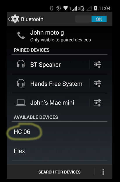 Utilizamos "Bluetooth Terminal" por qwerty como libre y trabajado, sin embargo usted puede elegir su propio. Una vez instalada la aplicación, necesita asociar el módulo de Bluetooth para el teléfono inteligente. Para ello, acceda al menú de Bluetooth dentro de configuración y, a continuación, buscar nuevos dispositivos. Después de un momento que aparecerá el dispositivo "HC06", por ejemplo, ver la imagen en este paso.