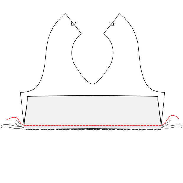 Estirar los hilos para reunir hasta la parte inferior de la blusa superior es el mismo ancho que el borde superior de la blusa inferior.