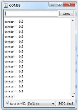 Abierta la P04_AnalogInOutSerial.ino,and subir a la Crowduino. Luego abra el monitor de serie, se puede ver el valor impreso en el puerto serie va a cambiar con el giro del potenciómetro en la zona 0 de ~ 1023.