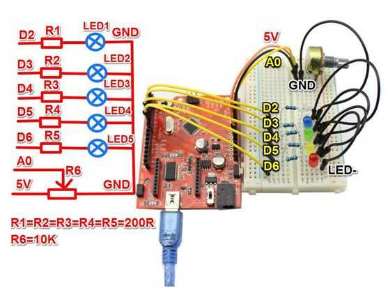 De los proyectos de superiores, sabe cómo hacer un proyecto sencillo. Hagamos ahora un pequeño proyecto. Qué tal hacer un LED de funcionamiento que es cambiable con el giro del potenciómetro de velocidad intermitente. Este proyecto consta de 5 LEDs en diferentes colores y un potenciómetro.
