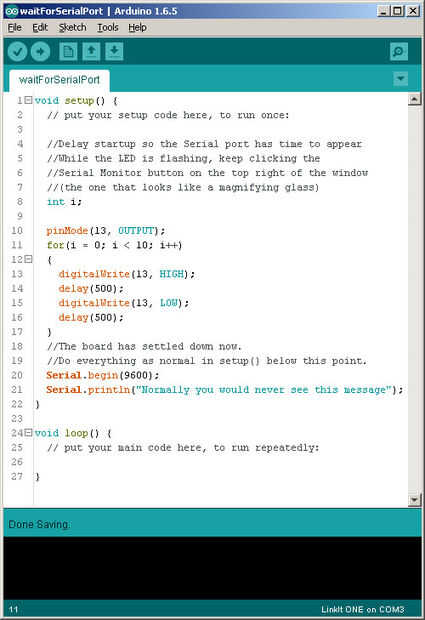 Básicamente esto espera 10 segundos desde el inicio, parpadea el LED a bordo feliz. Mientras esta intermitente, siga haciendo clic en el botón de Monitor Serial en el IDE de Arduino.