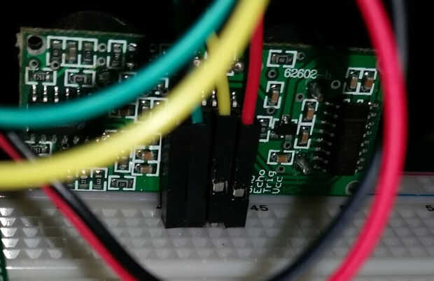 Inserte el sensor de distancia HC-SR04 en 4 columnas de la placa con el frente hacia el exterior. He utilizado columnas 40 a 43.