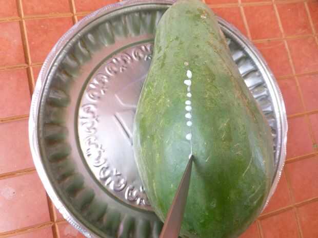 Antes de pelar y cortar la papaya, necesitamos vaciar la savia lechosa de la fruta.
