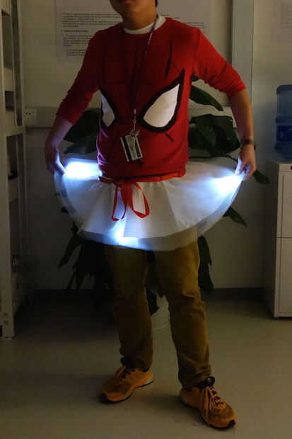 Que necesitaba mostrar a mis alumnos una manera simple de incorporar LEDs en un pedazo de tela, así que hice un tutu que enciende para arriba. Futuras versiones va a reaccionar al sonido, la luz o la aceleración. Pero para ahora, es simplemente activar o desactivar dependiendo de si la batería está en o no.