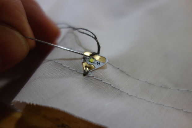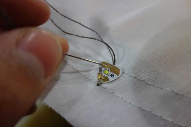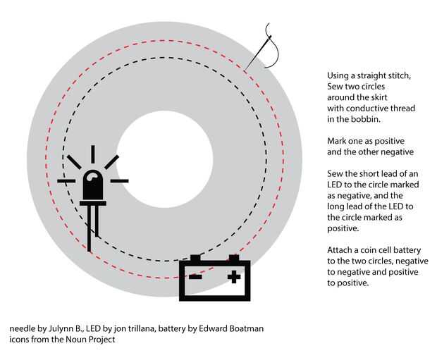 Para incrustarlos en el tutú, coser dos círculos cerca del borde de la guarnición con el hilo conductor de la bobina. Asegúrese de que no se toquen, o bien será corto circuito! Marque uno de los puntos conductores como positivo y el otro como negativo. Coser los LEDs con hilo conductor más.