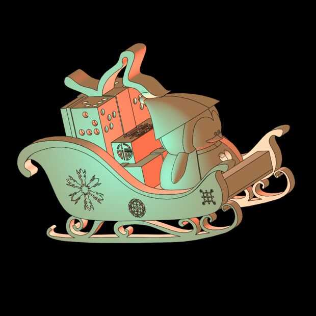 Proceso de diseño: Elegí un pingüino porque evocan invierno y también el Linux Tux. Tux está trayendo regalos divertidos de la ciencia y tecnología para todos! Debido a los regalos en el trineo y el sombrero de Santa, el ornamento tiene clase de una atmósfera de Navidad, pero quería evitar exclusiones y evocar un tema más general de vacaciones de invierno. Hice un gran copo de nieve con una estrella de David en el centro de Hanukkah y el otro con la Cruz en el centro para la Navidad. No queriendo dejar de lado la tercera religión abrahámica, hice un copo de nieve con el símbolo de la media luna y estrella en el centro. También, para incluir la otra celebración importante del invierno, agregué símbolos del año nuevo chino de la felicidad en un presente, por lo que Tux también trae los dones de la alegría y buen humor!