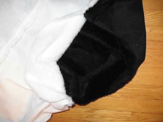 Tiempo para sujetar el vientre, una de las partes más molestas. Similar a las pompis, no va a ser el ajuste correcto, sólo tienes que forzarlo. Hacia el traje de revés y coser los lados peludos juntos. Utilice 5 pernos semejantemente a las pompis, uno en la mitad inferior, uno en el otro extremo de cada sección con curvas inferior y uno en los lados lejanos de cada sección con pequeñas curvas. Utilizar un montón de pines para hacer la tela como incluso como sea posible y coser sobre el tejido sobrante al tratar de mantener limpia. Seguir los planes para como adjuntarlo, pero asegúrese de que sólo coser un lado del vientre. El otro lado va a ser el punto de acceso para conseguir adentro y hacia fuera. No coser la parte superior del vientre al cuerpo principal, como colocar la nariz será muy difícil si lo haces.