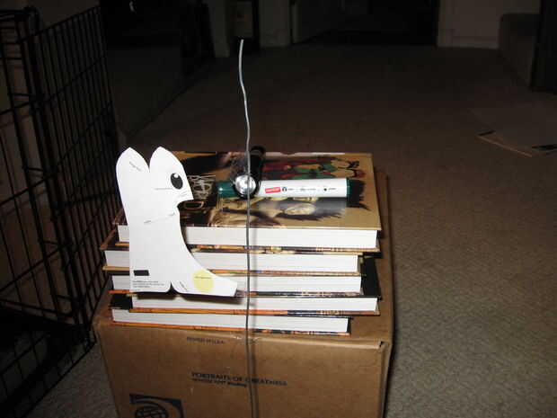 No tener un proyector de cualquier tipo, me vi obligado a lo fudge. Para seguir mi método, necesita alguna manera de sostener los patrones materiales estacionarios, elevación y una fuente de luz dirigida, más brillante, mejor. Utilicé un alambre largo grueso sujeto con una abrazadera en C los patrones fijos, y desplazamiento del alambre con la cinta. Básicamente, mantener el patrón fijo a una altura cercana a la fuente de luz y mover el patrón y la fuente de luz más cerca juntos para aumentar el tamaño de la sombra y más separada para disminuir el tamaño. Ajuste los dos hasta que la sombra es el tamaño calculado y luego traza alrededor de él en el periódico con un lápiz y luego ir sobre eso con un marcador una vez que estés seguro de que es el tamaño final deseado. Es el más brillante de la luz, más clara será la sombra y más fácil será el trazo.