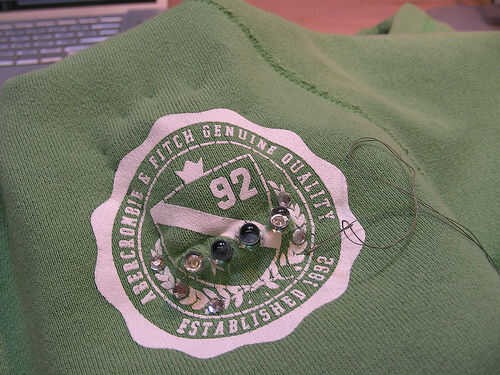 esta sudadera tiene un juego de corazón abierto en el pecho que es removible con broches magnéticos. El juego es impulsado por un paquete de lilypad arduino y batería fijado en el interior de la capucha. Atraviesa varios patrones los LEDs cuando la